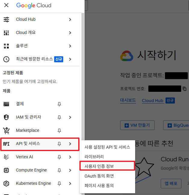 로그인 후, 콘솔로 접속, 좌측 상단의 버튼을 눌러 아래와 같이 API 및 서비스 → 사용자 인증 정보를 클릭한다.