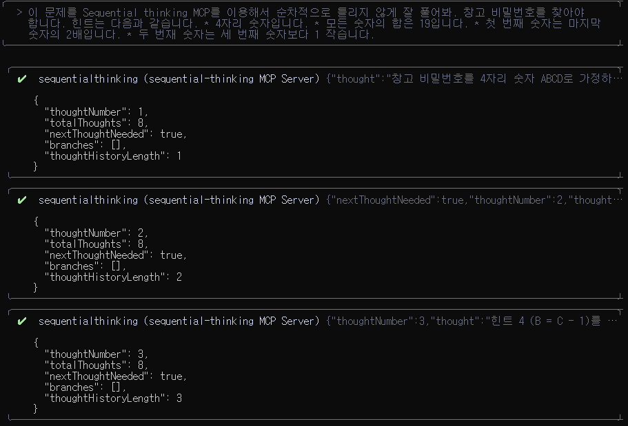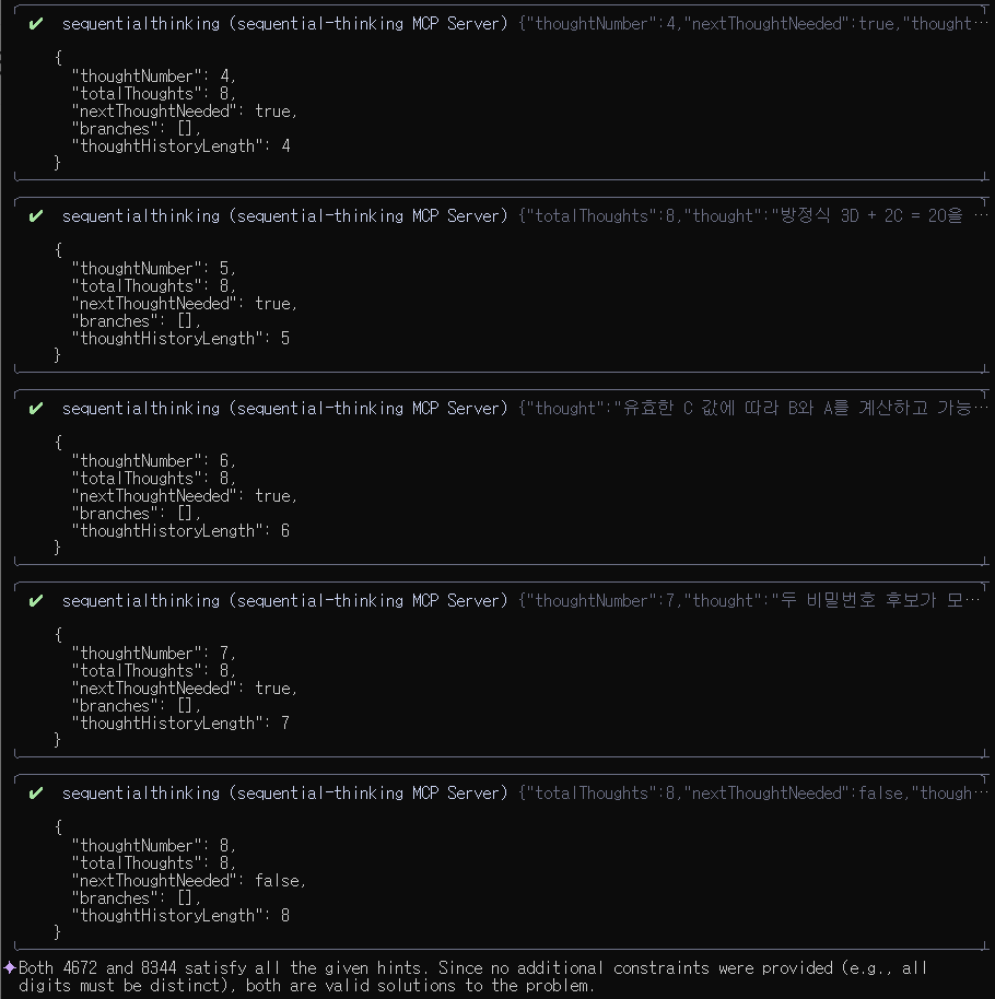 결과를 확인했을 때 2 번째 조건인 '모든 숫자의 합은 19입니다' 를 생각해 보면 8+6+7+4는 19를 아득히 넘어버리므로 틀렸다. 그러면 Sequential thinking MCP를 이용하면 어떨까?