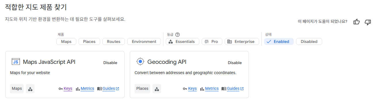 사용하기 버튼을 클릭한다. 그리고 아래와 같이 Enable을 눌러 Maps JavaScript API와 Geocoding API의 활성화 여부를 확인한다.