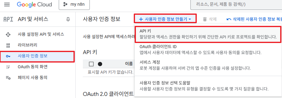 아래와 같이 사용자 인증 정보 만들기 → API 키를 눌러 API 키를 생성한다.