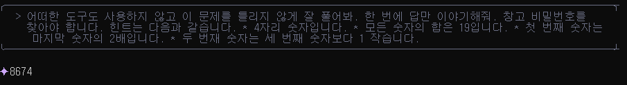 어떠한 도구도 사용하지 않고 이 문제를 틀리지 않게 잘 풀어봐. 한 번에 답만 이야기해줘. 창고 비밀번호를 찾아야 합니다. 힌트는 다음과 같습니다. * 4자리 숫자입니다. * 모든 숫자의 합은 19입니다. * 첫 번째 숫자는 마지막 숫자의 2배입니다. * 두 번재 숫자는 세 번째 숫자보다 1 작습니다.