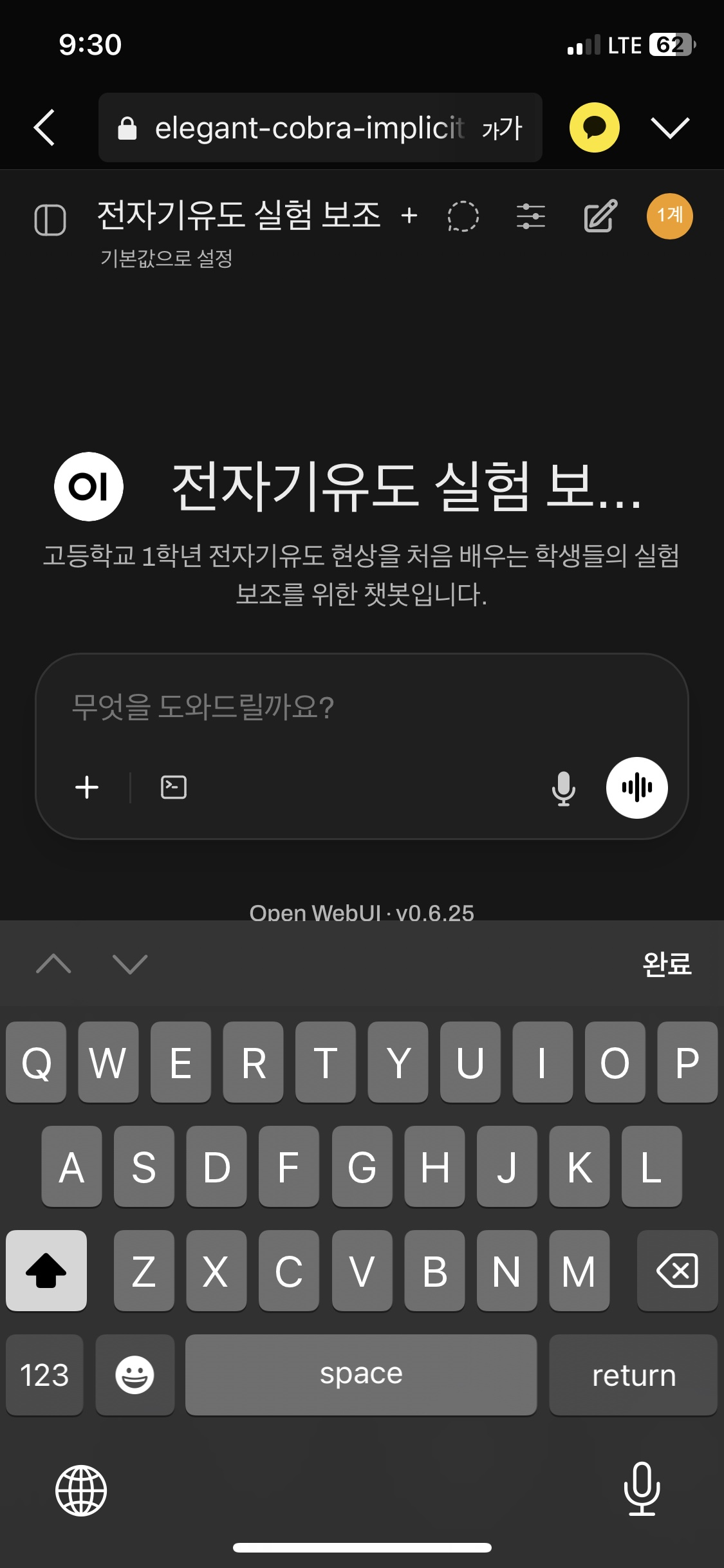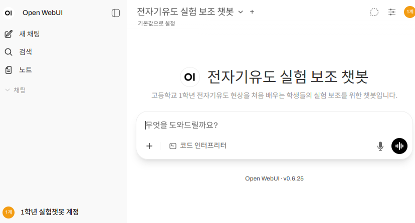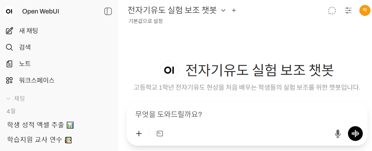 로그인을 하면 곧바로 '전자기유도 실험 보조 챗봇'이 뜬다. 모델을 선언할 때 '공개'를 선택했기 때문이다.