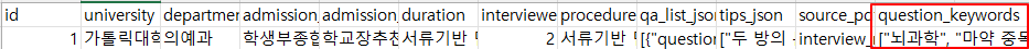 맨 마지막 컬럼을 주목하자. question_keywords라고 하여 질문에 대한 키워드가 추가된 것을 알 수 있다.