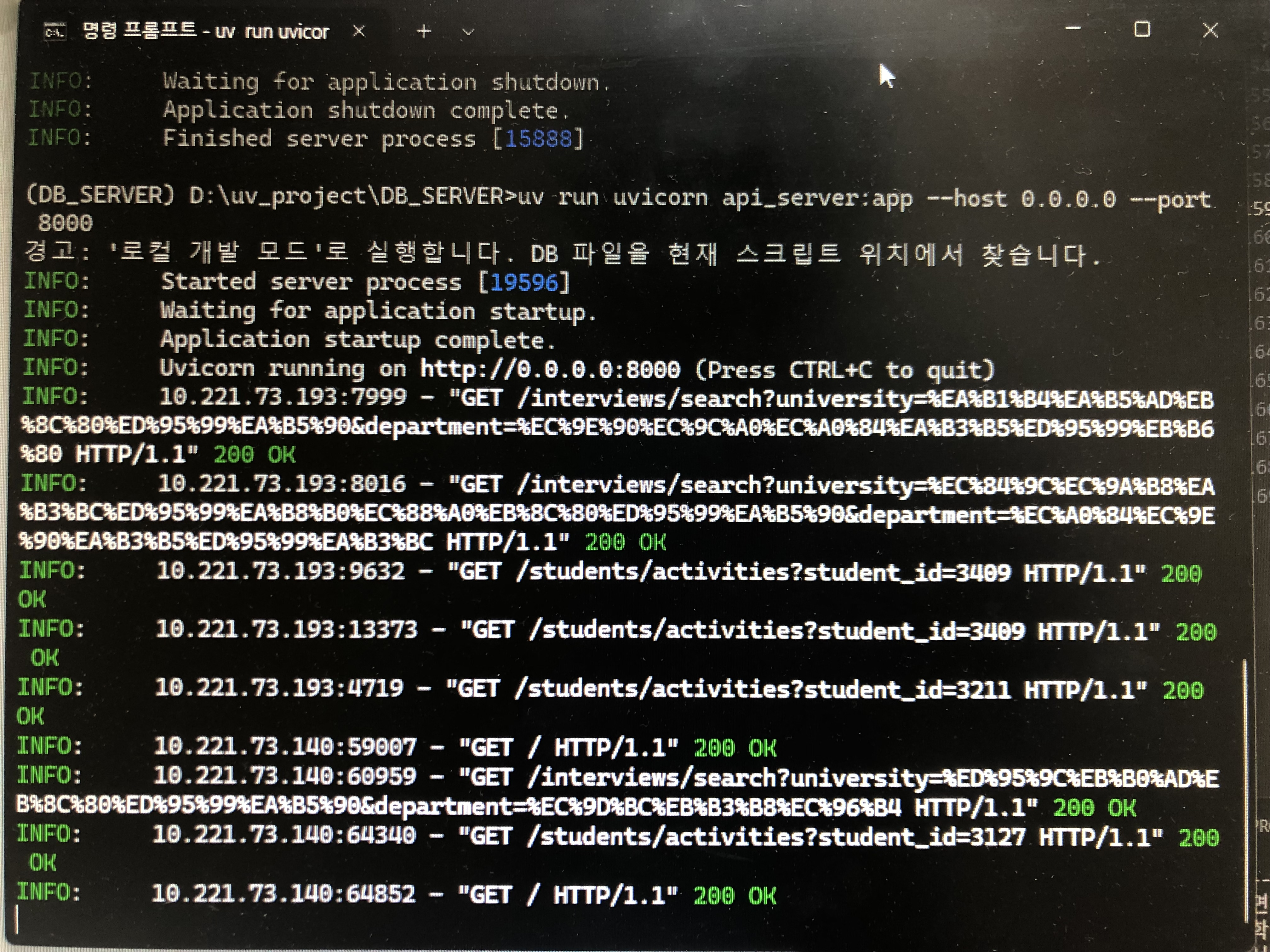 이에 학교 서버용 컴퓨터에 DB_SERVER라는 uv 가상환경을 준비하고 여기에 DB를 옳긴 다음, API 서버를 켜고 클라이언트에서 API 서버에 접속하여 정보를 가져오는 방식으로 변경하게 되었다.