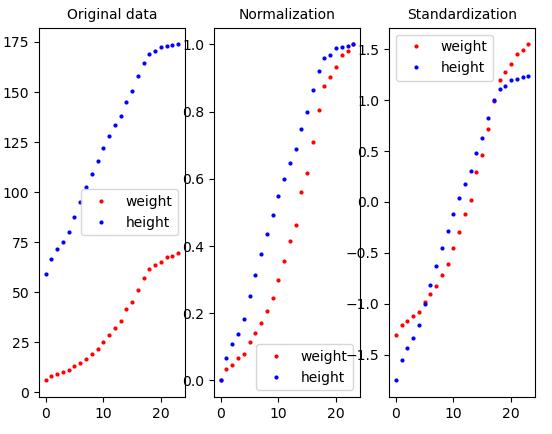 데이터를 데이터의 평균으로 뺀 값을 표준편차(std)로 나누는 것이다. 이렇게 하면 평균0, 표준편차 1인 공통 척도가 만들어진다. 이렇게 하면 데이터 간격의 크기는 달라질 수 있어도 데이터 간격의 의미는 달라지지 않는다. 그래프를 그려보면 데이터의 특징이 그대로 살아있는 것을 볼 수 있다.